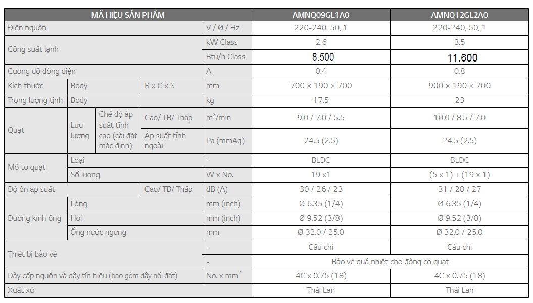 THÔNG SỐ KỸ THUẬT DÀN LẠNH NỐI ỐNG GIÓ LG MULTI SPLIT INVERTER AMNQ09GL1A0 (2.6KW) - 1.0HP