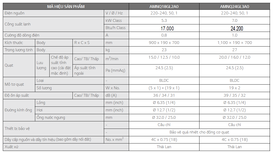 THÔNG SỐ KỸ THUẬT DÀN LẠNH NỐI ỐNG GIÓ LG MULTI SPLIT INVERTER AMNQ18GL2A0 (5.3kW) - 2.0HP