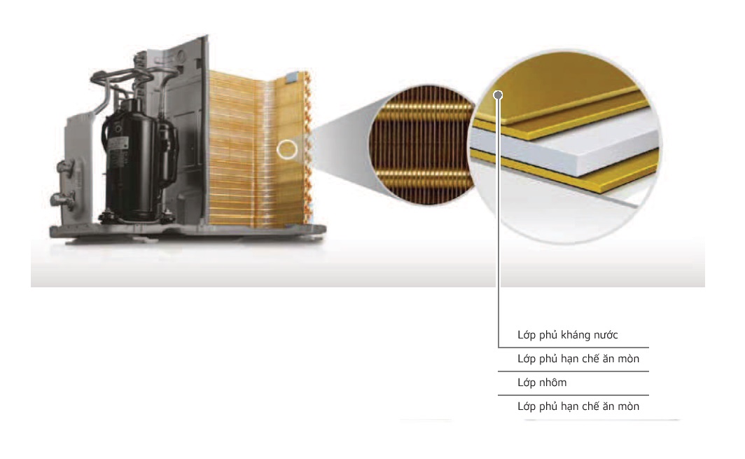 Lớp phủ Gold-Fin trên dàn tản nhiệt mang lại khả năng kháng nước, hạn chế sự ăn mòn, tăng tuổi thọ và độ bền máy, chống gỉ sét .... Sự bền bỉ và hiệu suất cao, tính thẩm mỹ luôn là điểm khiến LG nổi bật trong mắt khách hàng.