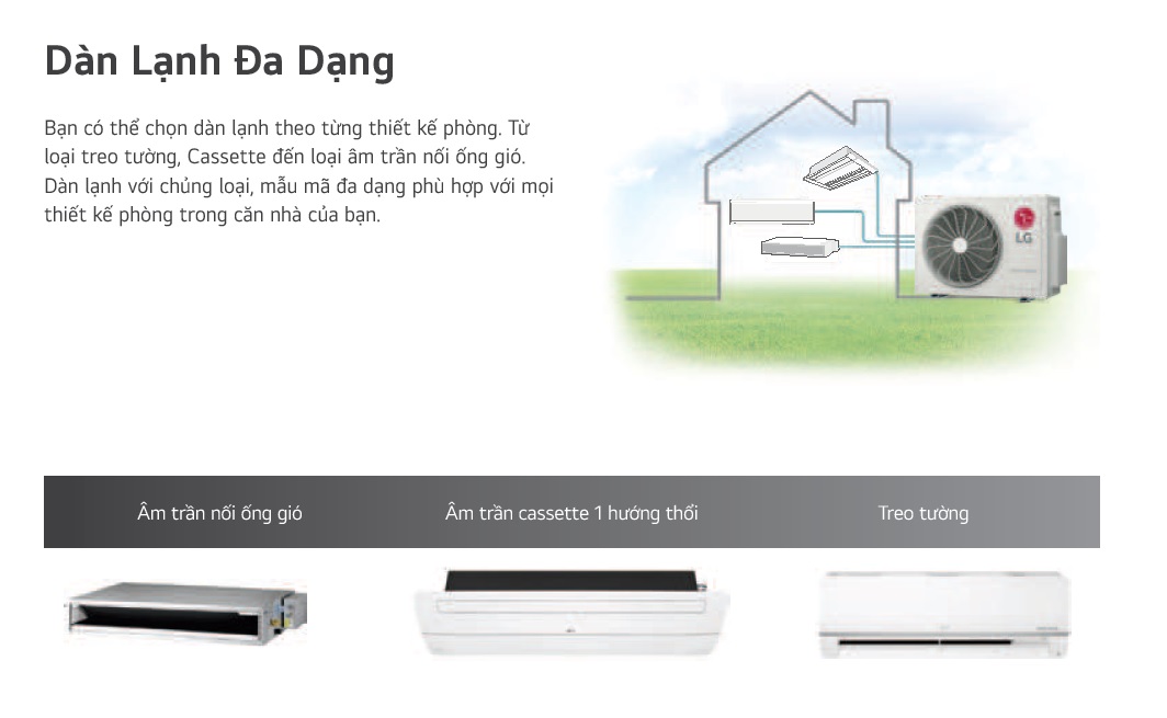Máy lạnh MULTI LG cho bạn tùy chọn linh hoạt giữa 3 loại dàn lạnh : treo tường, âm trần cassette 1 hướng thổi và giấu trần nối ống gió. Đáp ưng mọi nhu cầu, thiết kế nội thất sang trọng.