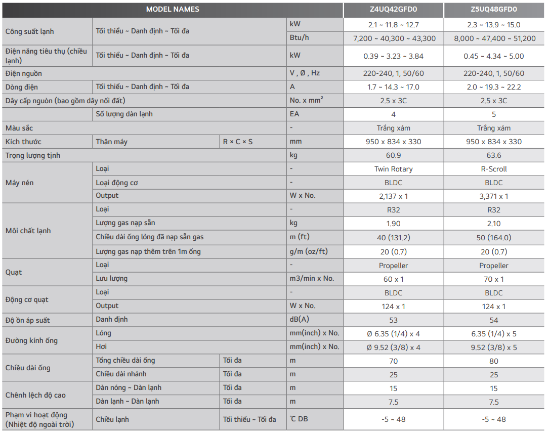 THÔNG SỐ KỸ THUẬT DÀN NÓNG MULTI SPLIT INVERTER LG Z5UQ48GFD0 (13.9kW) - 5.0HP