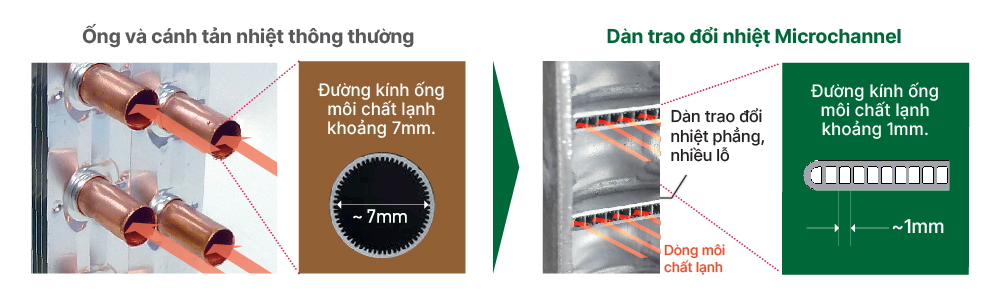 Dàn trao đổi nhiệt thông thường được thiết kế theo dạng ống với đường kính khoảng 7mm (nơi môi chất lạnh chảy qua) so với dàn tản nhiệt Microchannel được thiết kế theo dạng phẳng có nhiều lỗ nhôm có đường kính nhỏ chỉ khoảng 1mm. Điều này sẽ giúp giảm được đáng kế lượng môi chất lạnh cho điều hòa của người dùng.