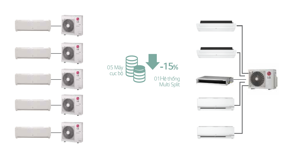 Bạn có biết giá của 5 máy cục bộ đắt hơn 1 hệ thống Multi Split? So với giá máy cục bộ, việc sử dụng hệ thống Multi Split sẽ giúp tiết kiệm đến 15% chi phí.