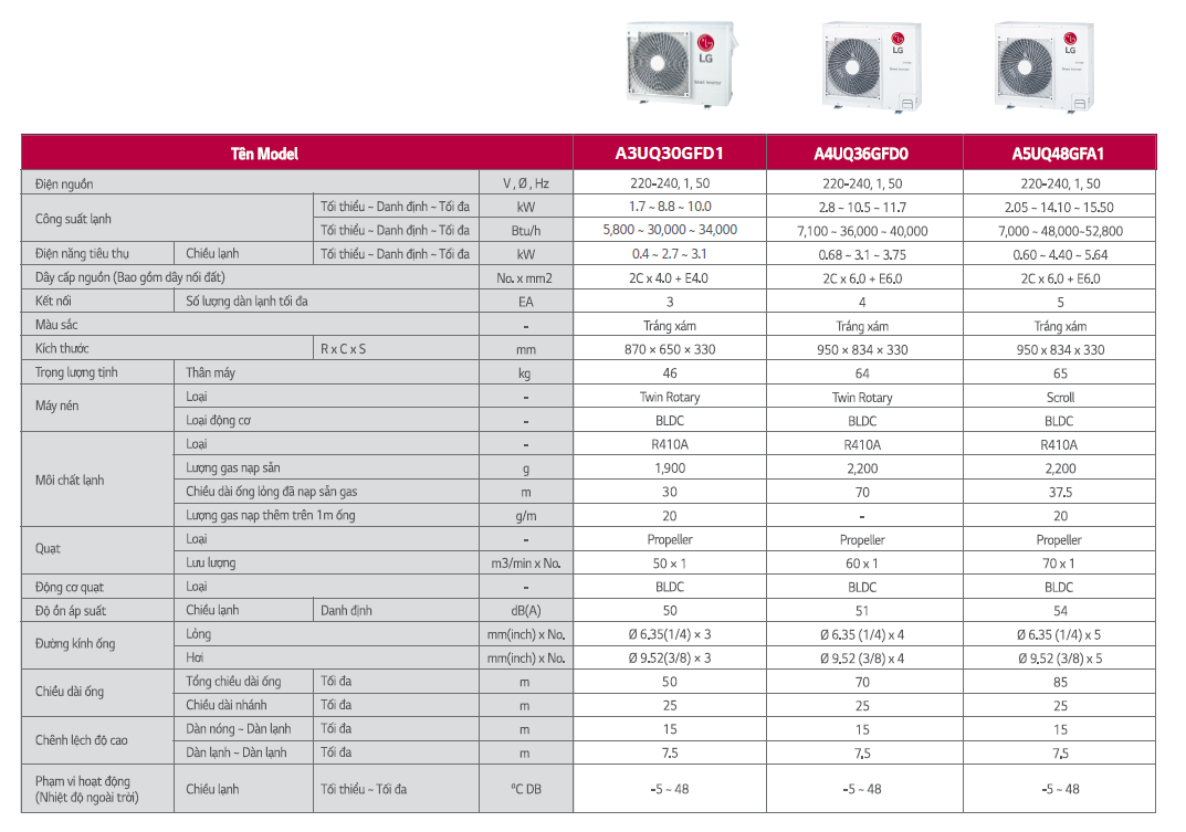 THÔNG SỐ KỸ THUẬT DÀN NÓNG LG MULTI SPLIT INVERTER