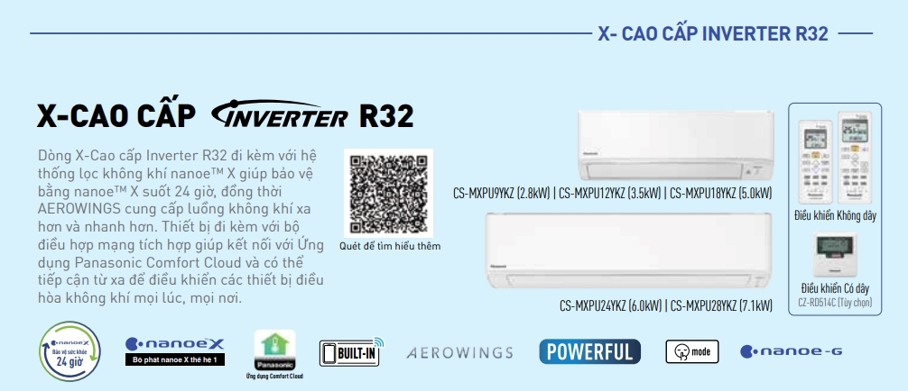 Dòng Cao cấp Inverter R32 được trang bị công nghệ nanoe™ X lọc không khí 24 giờ. Tận hưởng luồng không khí mạnh hơn và mát hơn với AEROWINGS. Với Wi-Fi được tích hợp sẵn, giúp dễ dàng kết nối với ứng dụng Panasonic Comfort Cloud để điều khiển từ xa các máy điều hòa không khí mọi lúc, mọi nơi. Tận hưởng không gian mát mẻ, đồng thời tiết kiệm năng lượng tối đa mà không ảnh hưởng đến sự thoải mái với công nghệ Inverter và môi chất lạnh R32.