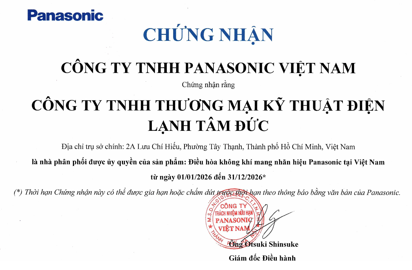 Công ty TNHH Thương mại Kỹ thuật Điện lạnh Tâm Đức ( Điện lạnh Tâm Đức ) là đại lý bán hàng ủy quyền Panasonic, nhiều năm liên tục công nhận đại lý chiến lược, luôn tuân thủ quy định của hãng trong việc tư vấn và cấp phối máy lạnh.