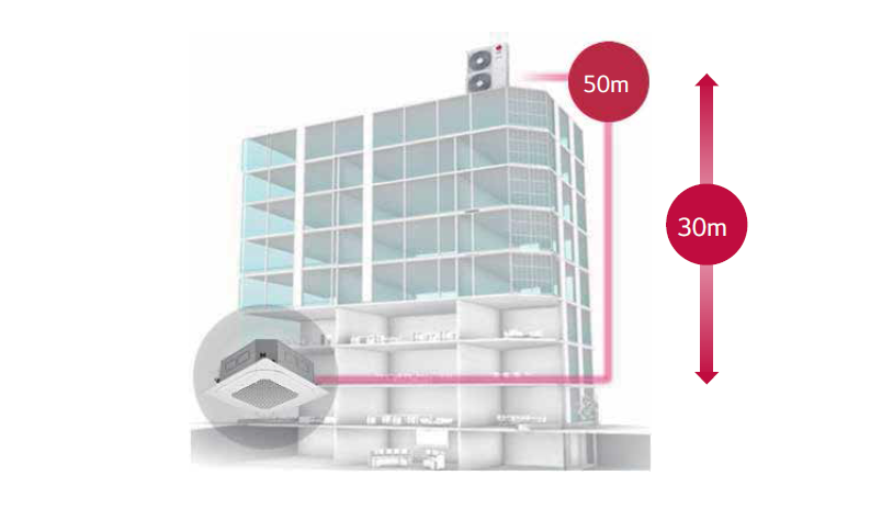 Sử dụng các sản phẩm của LG, tổng chiều dài đường ống có thể đạt tối đa 50 m và chênh lệch độ cao có thể đạt tối đa 30 m.