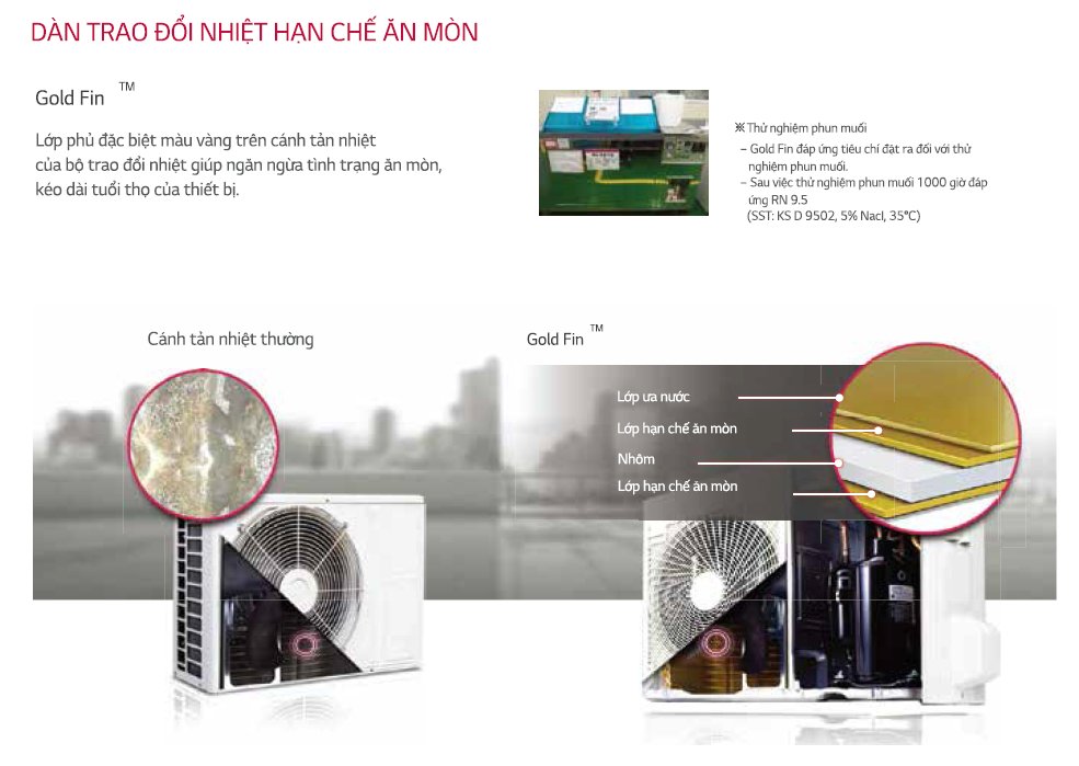 Gold Fin TM Lớp phủ đặc biệt màu vàng trên cánh tản nhiệt của bộ trao đổi nhiệt giúp ngăn ngừa tình trạng ăn mòn, kéo dài tuổi thọ của thiết bị.