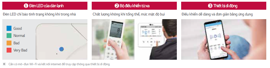 Có thể dễ dàng kiểm tra tình trạng của không khí bằng các thiết bị khác nhau như đèn LED của dàn lạnh, Bộ điều khiển từ xa không dây / có dây hoặc điện thoại di động