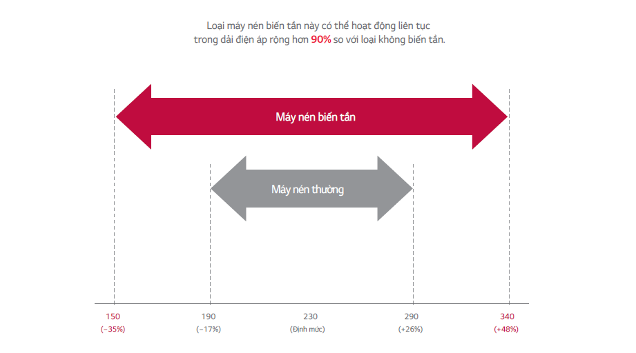 Máy nén biến tần thông minh của LG có thể hoạt động ở dải điện áp rộng hơn so với loại không biến tần.