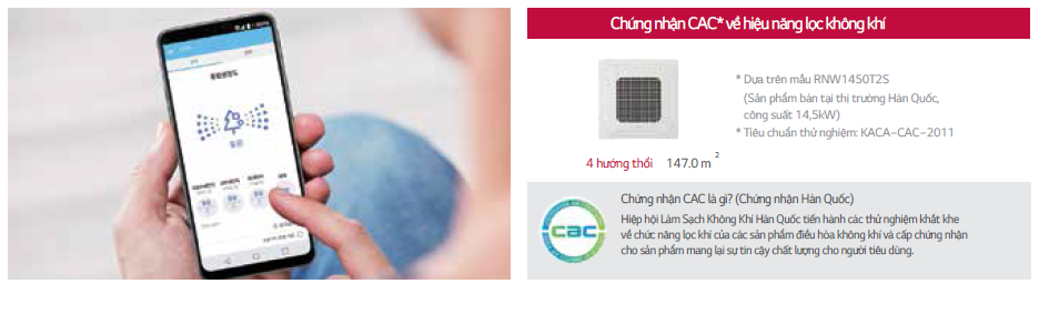 1 dàn lạnh có thể lọc không khí cho khu vực rộng tối đa 147,0 m2. (Ðảm bảo bằng chứng nhận CAC cho sản phẩm nội địa Hàn Quốc)