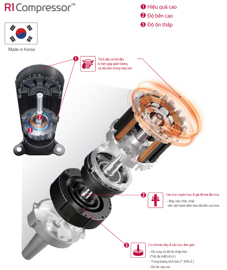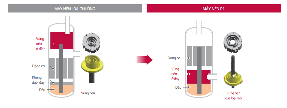 Máy nén R1 có cấu trúc nén đơn giản và ổn định hơn với các đặc tính độ rung thấp của máy nén xoắn ốc