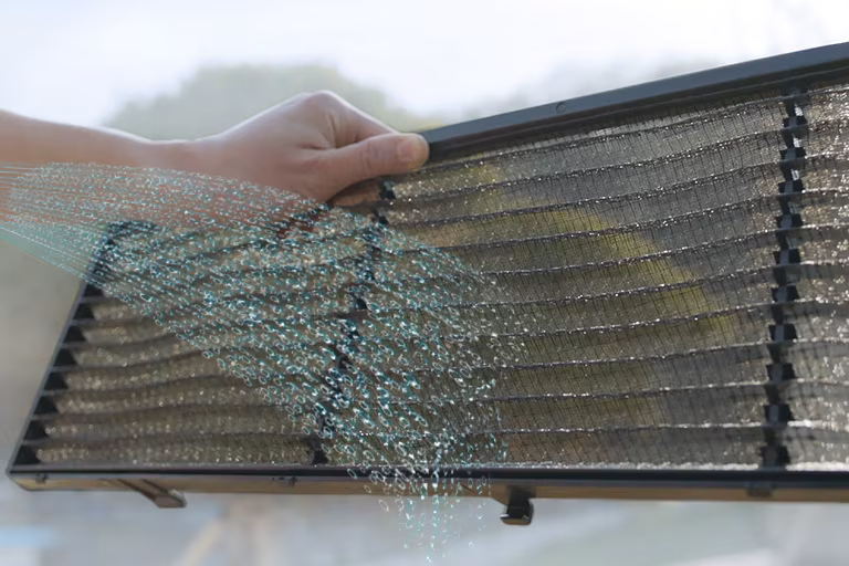Một người đang cầm và rửa một bộ lọc hình chữ nhật màu đen bằng nước. Tiết kiệm chi phí thay thế với bộ lọc bán vĩnh cửu dễ làm sạch.