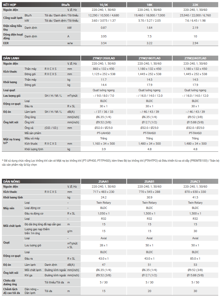 THÔNG SỐ KỸ THUẬT MÁY LẠNH ÂM TRẦN CASSETTE 1 HƯỚNG THỔI LG INVERTER ZTNQ Series
