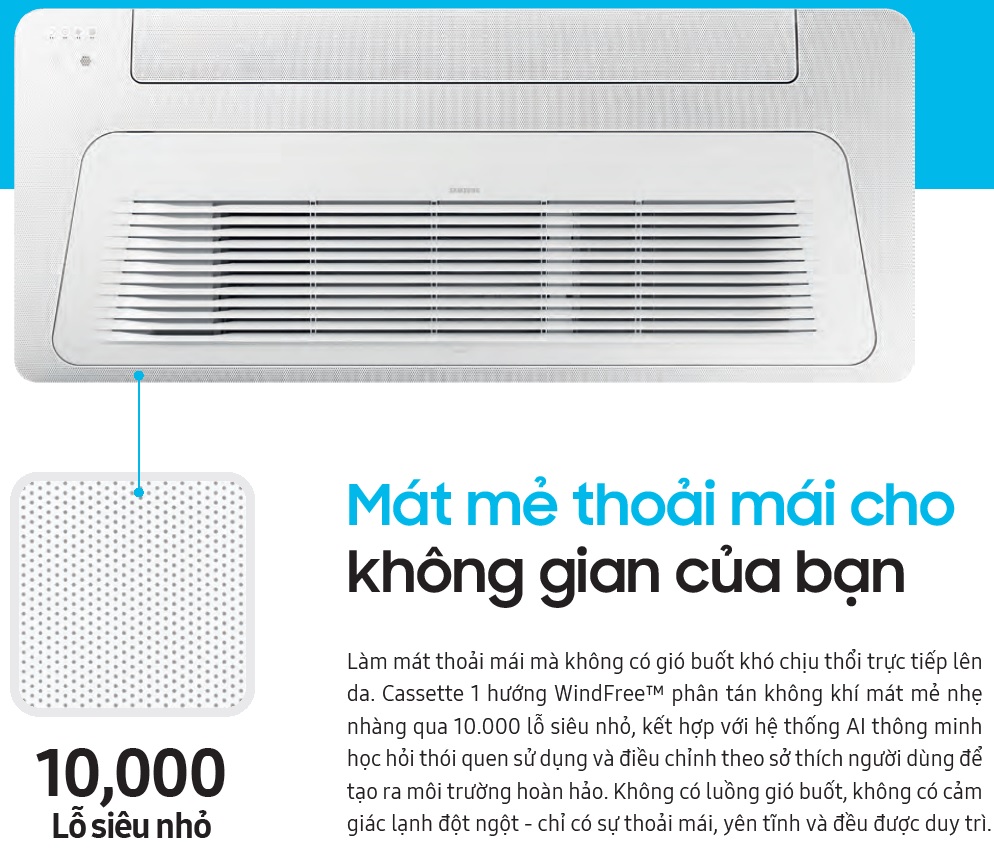 Công nghệ WindFree™ phân tán hơi lạnh qua 10.000 lỗ li ti siêu nhỏ, tránh gió thổi trực tiếp vào người, kết hợp với trí tuệ nhân tạo A.I học hỏi thói quen người dùng nhằm tùy chỉnh theo thực tế, tạo ra môi trường mát mẻ dễ chịu, không thay đổi nhiệt độ đột ngột, không có cảm giác lạnh buốt, hoạt động yên tĩnh, không tiếng ồn