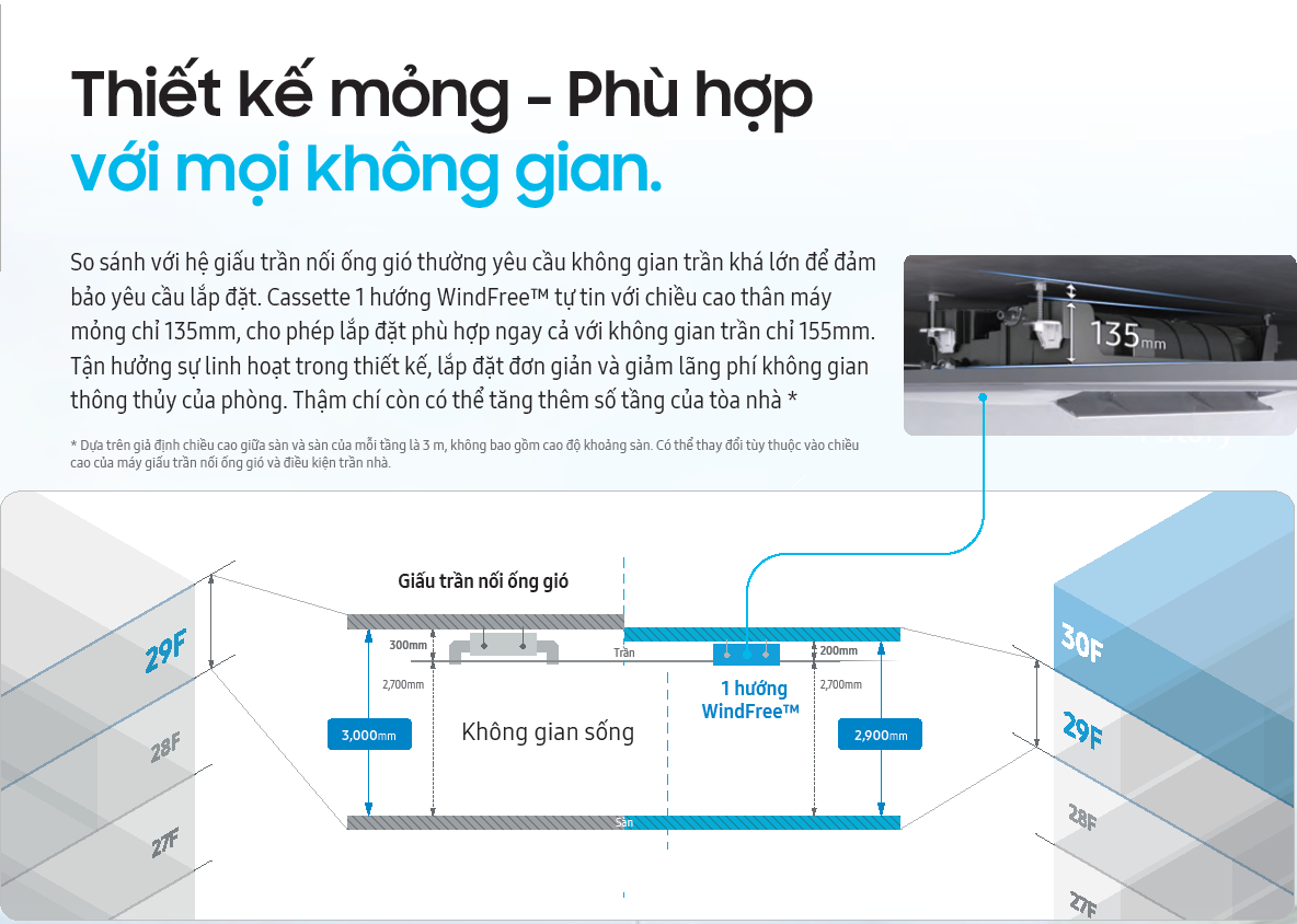 Thân máy với độ dày chỉ 135mm, có thể lắp đặt chỉ với chiều cao trần 155mm mang lại sự linh hoạt tối đa trong quá trình thiết kế và thi công. Tiện ích hơn, giảm lãng phí không gian hơn cùng Âm trần 1 hướng thổi Samsung.