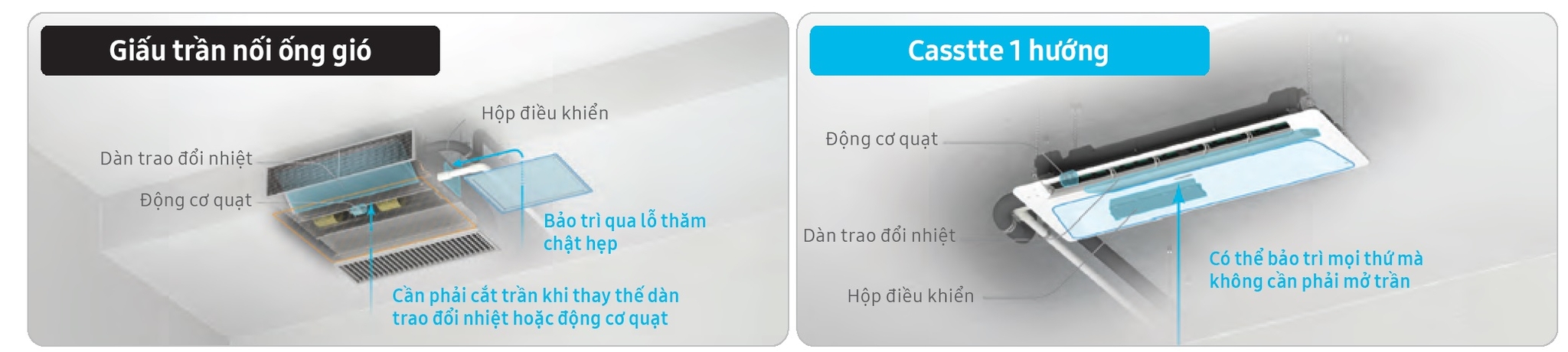 Có thể tiếp cận trực tiếp linh kiện máy chỉ bằng thao tác tháo mặt nạ từ bên dưới thuận tiện cho việc bảo dưỡng và sữa chữa khi cần thiết. Không phải sử dụng lỗ thăm trần, bảo đảm thẩm mỹ cho công trình.
