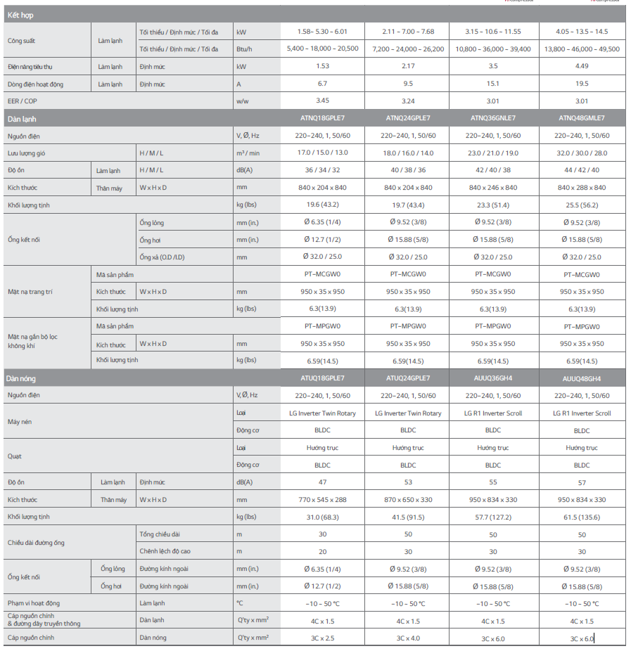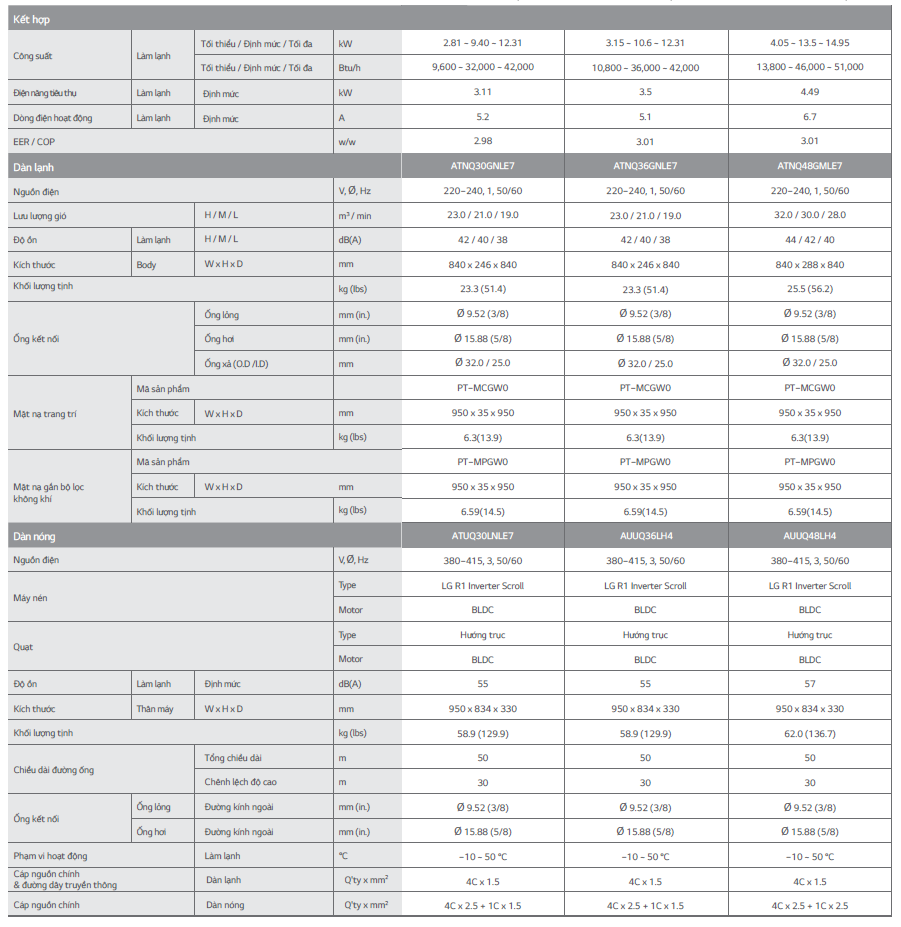 THÔNG SỐ KỸ THUẬT MÁY LẠNH ÂM TRẦN CASSETTE LG INVERTER ATNQ36GNLE7 (4.0HP)