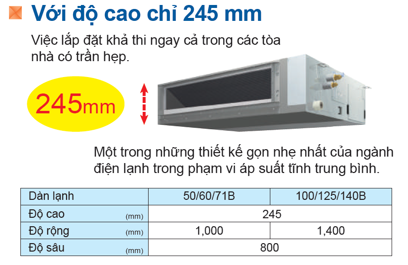 Lắp đặt dễ dàng ở các vị trí trần nhà hẹp với chiều cao chỉ 245 mm.