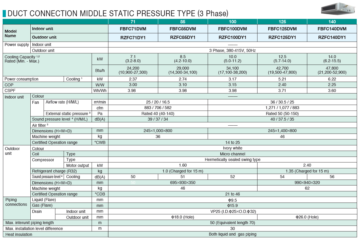 THÔNG SỐ KỸ THUẬT MÁY LẠNH GIẤU TRẦN NỐI ỐNG GIÓ DAIKIN INVERTER FBFC140DVM9/RZFC140DY1 (5.5HP)