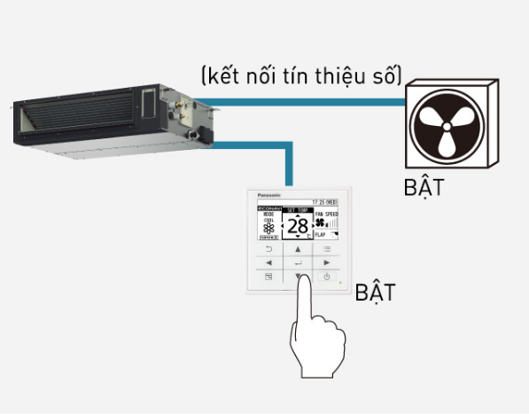 Khi thiết bị ngoại vi như quạt thông gió được kết nối với dàn lạnh, các chế độ Bật/Tắt quạt thông gió có thể thực hiện bằng bộ điều khiển có dây.