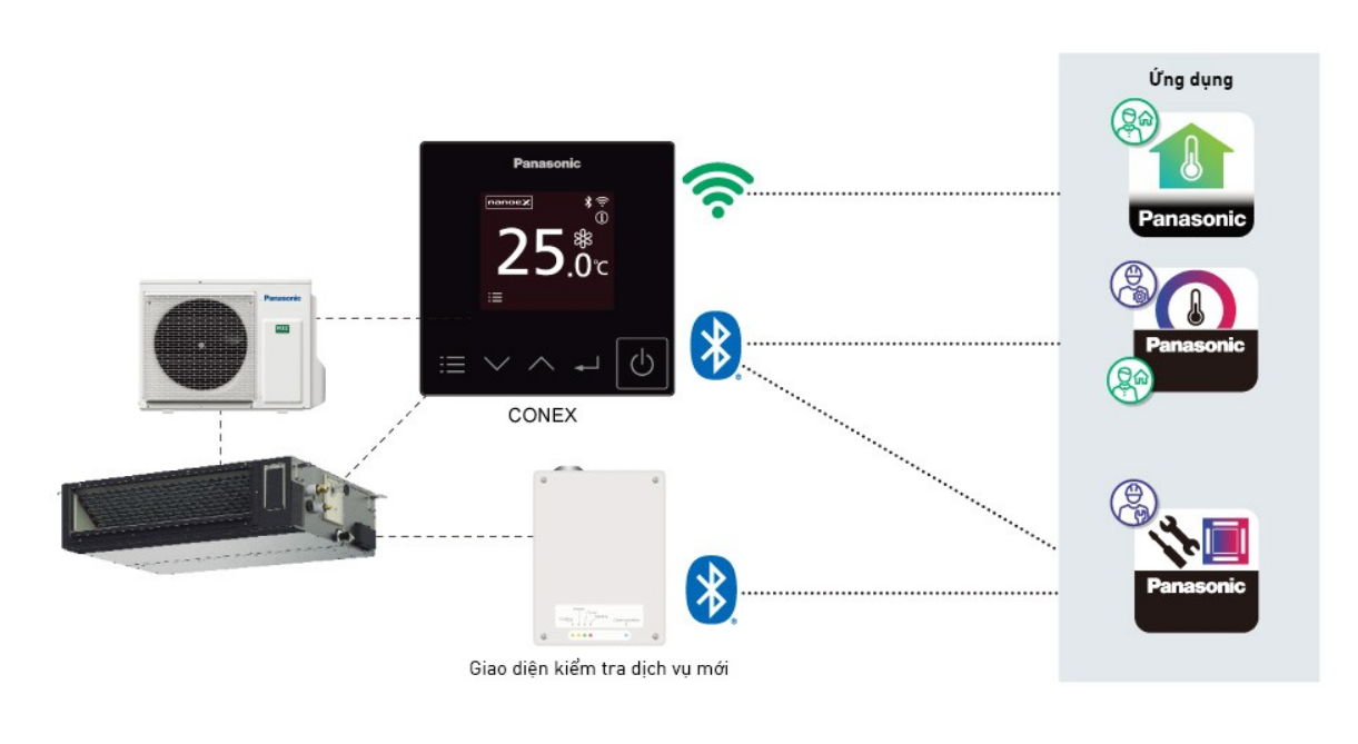 Với bộ chuyển đổi mạng tích hợp và ứng dụng Panasonic Comfort Cloud, kết nối tối đa 20 máy điều hòa không khí tại 1 địa điểm (tối đa 10 địa điểm), truy cập từ xa tất cả các tính năng điều hòa không khí, theo dõi và giám sát việc sử dụng các máy điều hòa không khí bằng cách sử dụng chức năng thống kê năng lượng toàn diện và xác định các vấn đề bằng thông báo lỗi để khắc phục sự cố dễ dàng, tất cả chỉ từ một thiết bị di động.