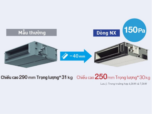 - Cột áp mạnh mẽ lên tới 150Pa, dàn lạnh chỉ cao 250mm nhỏ gọn, tiết kiệm không gian