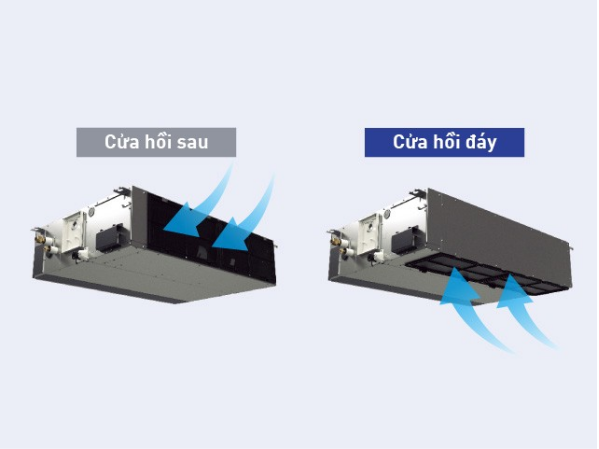 - Cửa lấy gió tươi mặc định phía sau. Dàn lạnh có thể đặt đứng hoặc nằm ngang