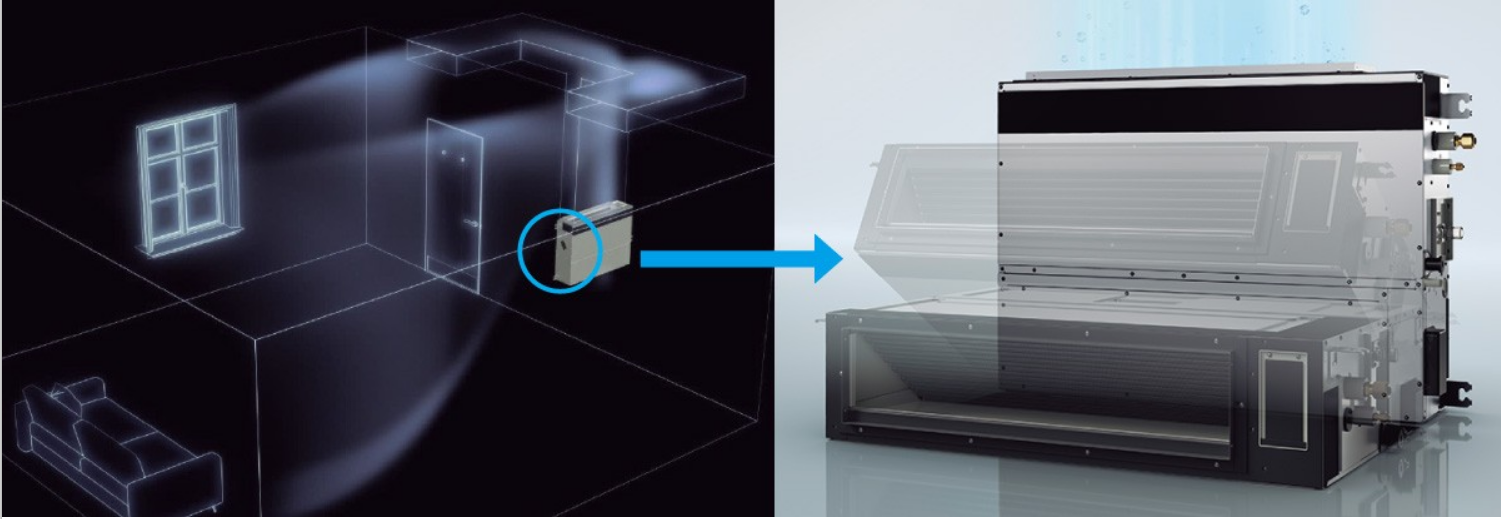 Kết hợp quạt dàn lạnh cột áp cao, model này đảm bảo không khí được thanh lọc nhờ nanoe™ X di chuyển dễ dàng và không bị ảnh hưởng bởi nhiều hình dạng ống gió với độ dài lên tới 10m, cũng như lý tưởng để sử dụng trong không gian lớn hơn.