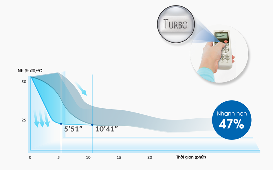 Với công nghệ làm lạnh nhanh “TURBO” của điều hòa AQUA, điều hòa hoạt động ở chế độ đặc biệt được cài đặt với tần số cao. Nhiệt độ phòng sẽ đạt đến nhiệt độ cài đặt trong thời gian ngắn nhất.