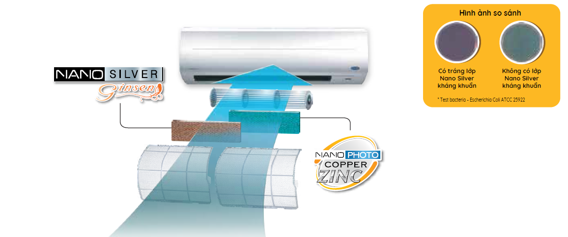 Công nghệ Nano Photo - copper Zinc rất mạnh mẽ trong việc khử mùi vì lưới lọc có chứa các hạt phân tử dễ kết hợp với các mùi để triệt tiêu. Nano Photo Copper cũng có khả năng diệt khuẩn và chống nấm mốc.