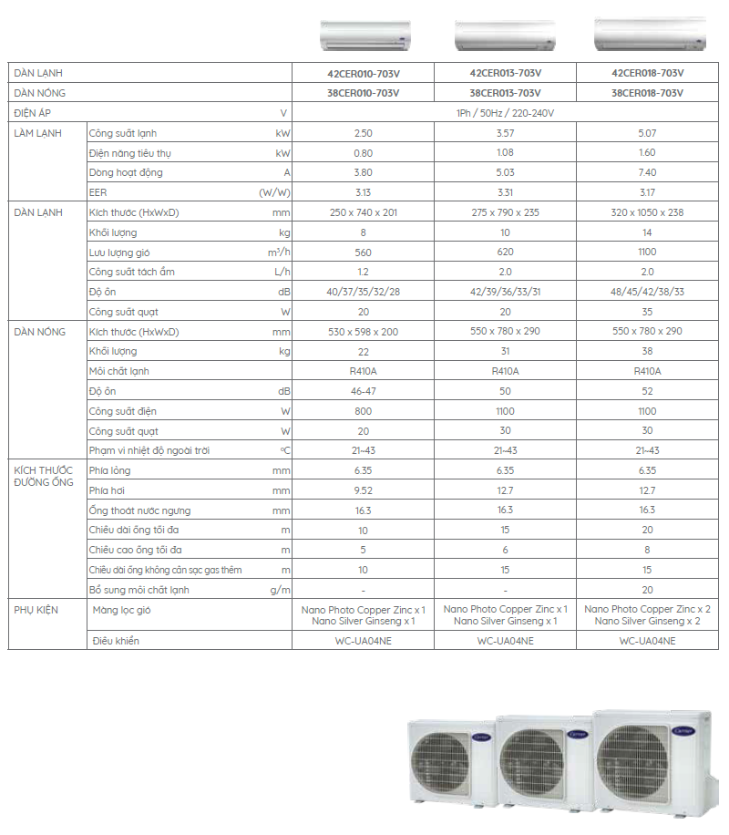 THÔNG SỐ KỸ THUẬT MÁY LẠNH TREO TƯỜNG NON INVERTER CARRIER 38/42CER013 (1.5HP)