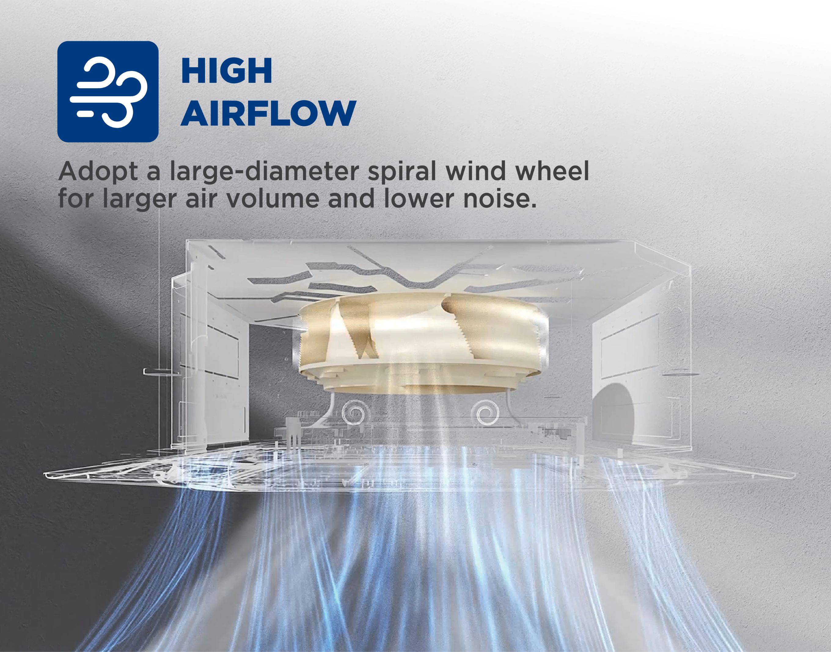 Sử dụng một quạt gió xoắn ốc đường kính lớn tạo ra lưu lượng gió lớn hơn và tiếng ồn thấp hơn.