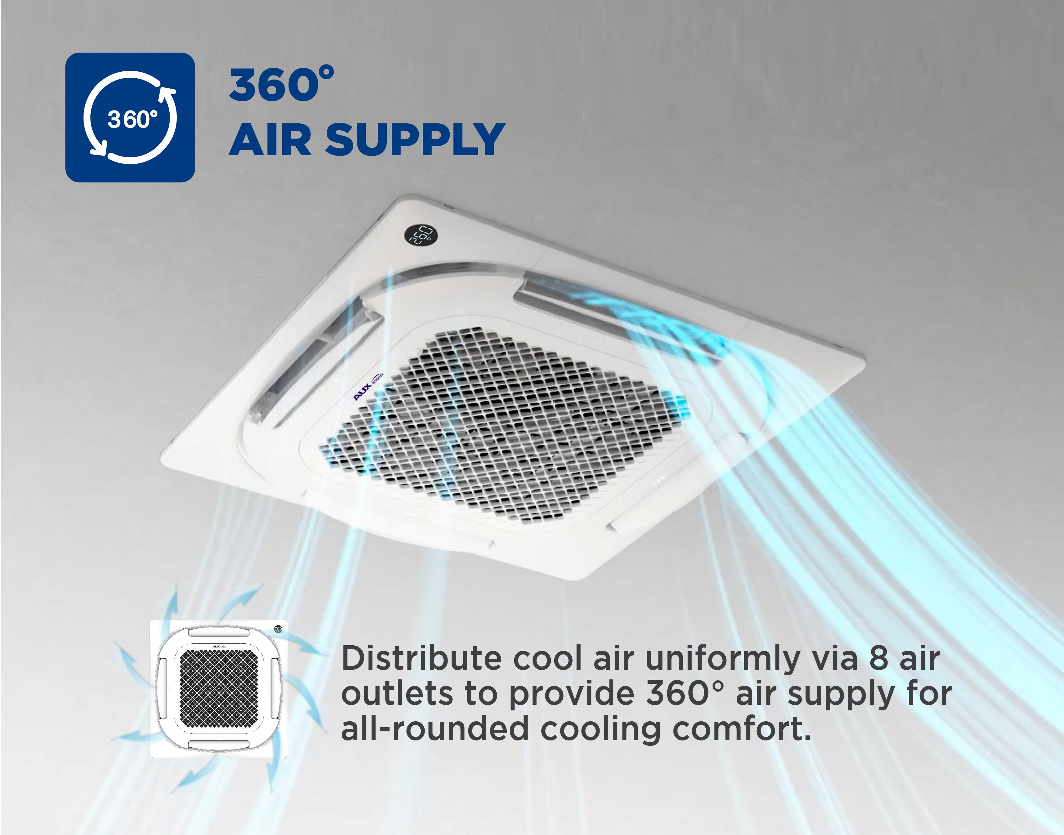 Lan tỏa gió lạnh 360 độ trải rộng đến mọi ngóc ngách trong phòng. Phân phối không khí một cách đều, trải rộng. Mát lạnh 360 độ thông qua 8 cửa gió để làm mát hoàn toàn không gian.