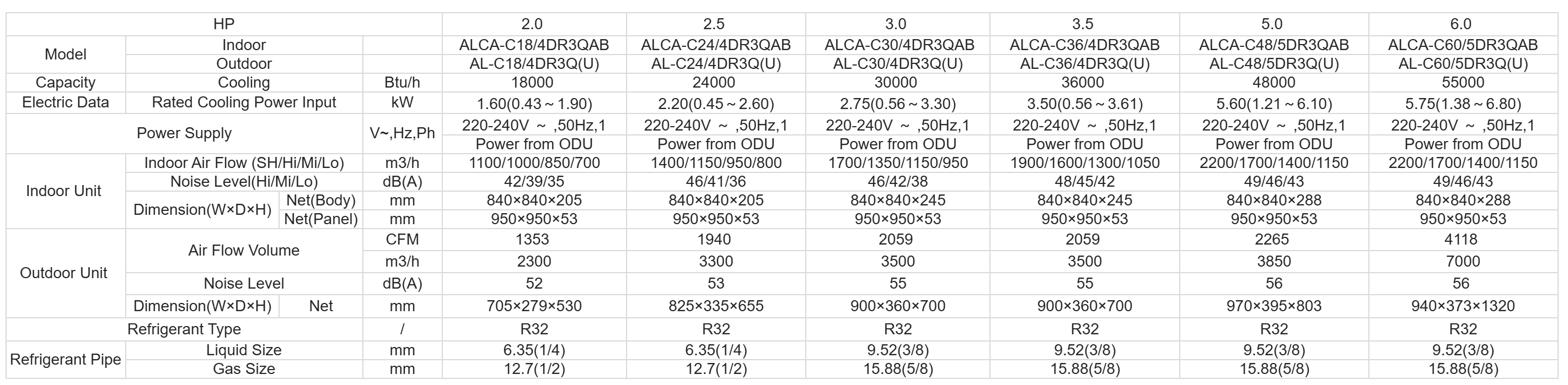 THÔNG SỐ KỸ THUẬT MÁY LẠNH CASSETTE ÂM TRẦN INVERTER AUX ALCA-C60/5DR3QAB/ AL-C60/5DR3Q(U) (6.0HP)