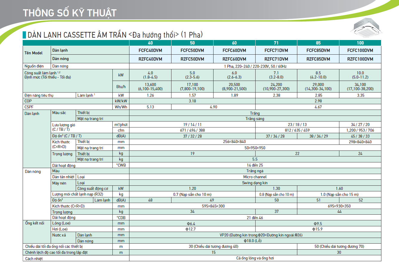 THÔNG SỐ KỸ THUẬT MÁY LẠNH CASSETTE ÂM TRẦN DAIKIN INVERTER FCFC40DVM/RZFC40DVM (1.5HP)
