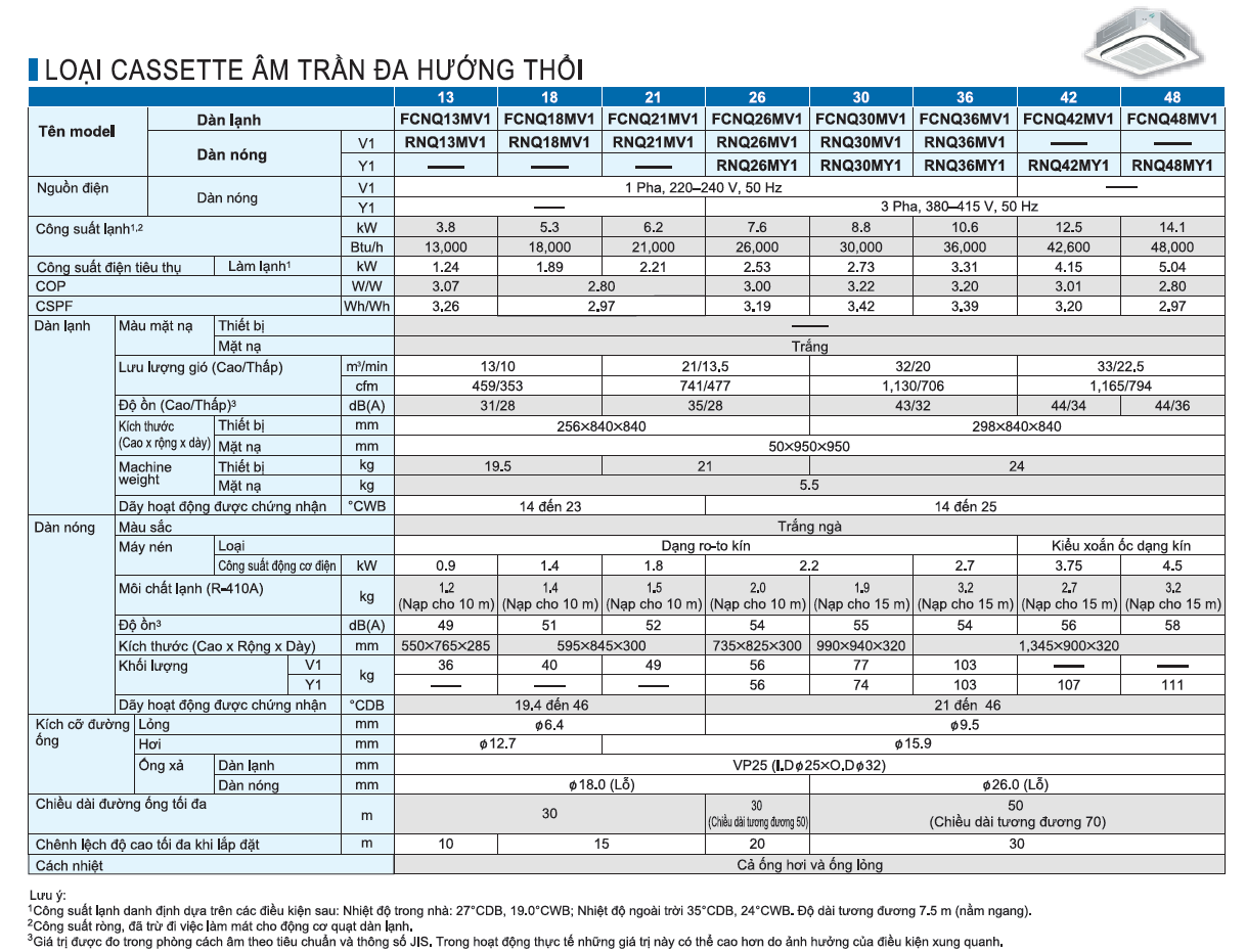 THÔNG SỐ KỸ THUẬT MÁY LẠNH CASSETTE ÂM TRẦN DAIKIN NON INVERTER FCNQ13MV1/RNQ13MV1 (1.5HP)