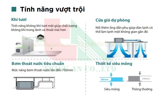Với độ dày chỉ 260 mm, máy có thể được lắp đặt bên dưới các trần nhà hẹp.Với tiêu chí đầu tư tiết kiệm, thương hiệu uy tín, chất lượng đảm bảo để lắp đặt cho phòng khách, cửa hàng, hay văn phòng dưới 50 m2.