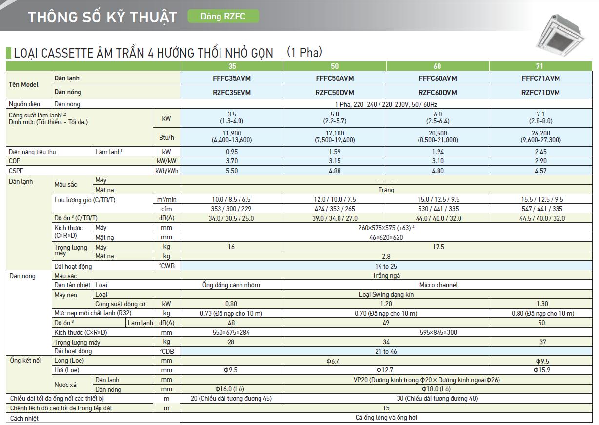 THÔNG SỐ KỸ THUẬT MÁY LẠNH CASSETTE ÂM TRẦN NHỎ GỌN DAIKIN INVERTER FFFC35AVM/RZFC35EVM (1.5HP)