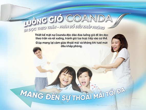 Thiết kế Coanda độc đáo đưa luồng gió đi dọc theo trần nhà, phân bổ không khí tươi mát đều khắp phòng tránh gió lùa trực tiếp vào cơ thể, giúp mang lại cảm giác thoải mái tối đa