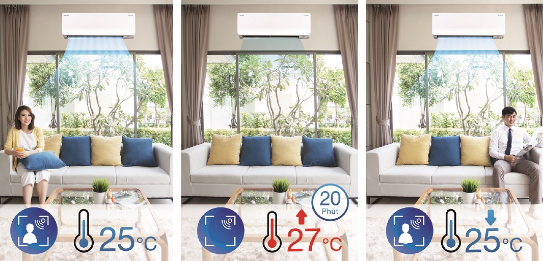 Mắt thần thông minh ngăn hao phí điện năng bằng việc phát hiện chuyển động của người trong phòng. Nếu không có chuyển động nào trong vòng 20 phút, máy sẽ tự động điều chỉnh tăng nhiệt độ cài đặt 2°C và giảm 2°C nếu phát hiện có người quay lại