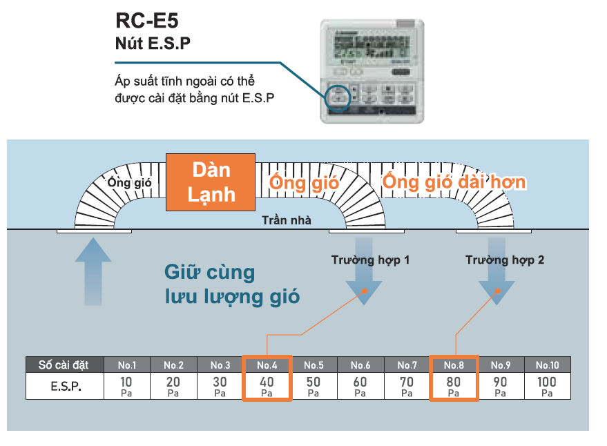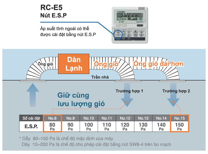Bạn có thể cài đặt áp suất tĩnh ngoài (E.S.P) bằng cách điều chỉnh nút E.S.P trên bộ điều khiển có dây. Dàn trong nhà sẽ kiểm soát tốc độ quạt sao cho bảo đảm được lưu lượng gió ở mỗi mức tốc độ khác nhau. Bạn có thể điều chỉnh áp suất tĩnh mong muốn bằng cách tính toán lưu lượng gió và áp suất hao hụt trên ống gió, sau đó cài đặt trên remote dây