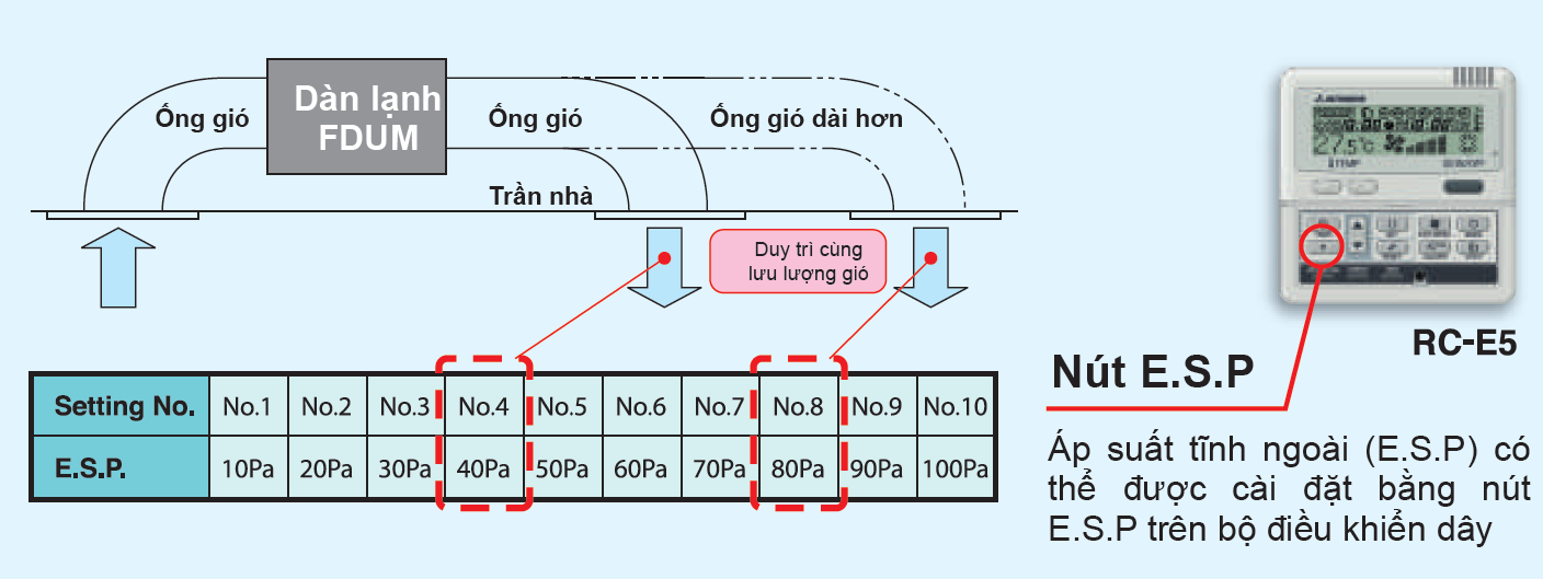 Được thiết kế đơn giản. Sử dụng mô tơ DC, lưu lượng gió có thể đạt được bằng sự điều khiển tự động. Dàn lạnh có thể nhận biết áp suất tĩnh bên ngoài và duy trì lưu lượng gió