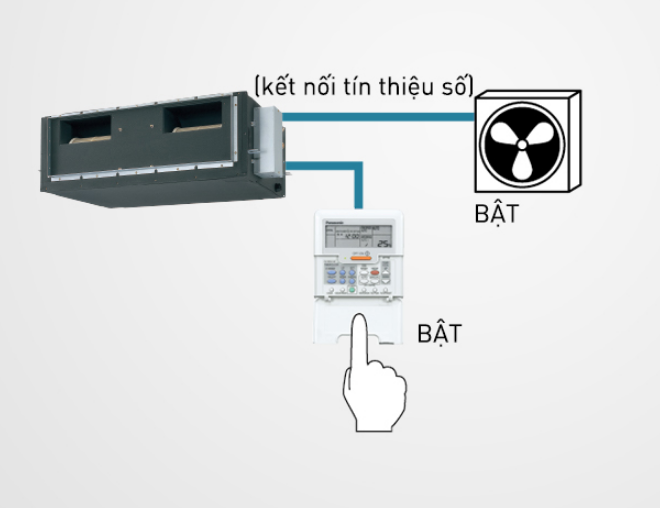 Khi thiết bị ngoại vi như quạt thông gió được kết nối với dàn lạnh, các chế độ Bật/Tắt quạt thông gió có thể thực hiện bằng bộ điều khiển có dây. Bạn có thể lựa chọn điều khiển quạt thông gió bằng điều khiển có dây được kết nối với quạt hoặc bằng điều khiển riêng của quạt. (Quạt phải có bo mạch giao thức kết nối với CZ-TA31P)