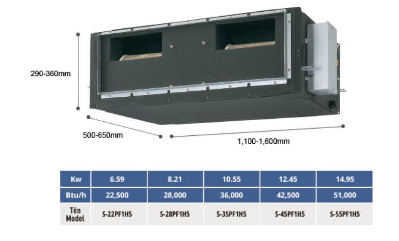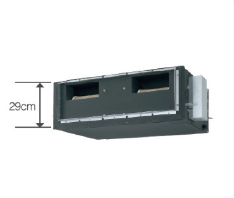 Chiều cao dàn lạnh chỉ 29cm cho phép lắp đặt trong không gian trần hạn chế. Kiểu dáng thanh nhã, trọng lượng nhẹ giúp việc lắp đặt trở nên đơn giản và hài hòa với mọi thiết kế nội thất (S-22PF1H5, S-28PF1H5)