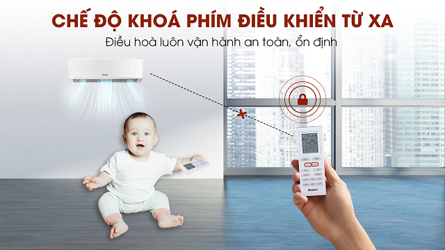 Gree trang bị cho điều hoà Kool chế độ khoá phím điều khiển từ xa (remote). Để kích hoạt, bạn chỉ cần nhấn giữ cùng lúc phím tăng và giảm trên remote. Lúc này, toàn bộ các phím chức năng sẽ bị vô hiệu hoá, tránh trường hợp người dùng vô tình chạm tay vào remote, nhất là đối với gia đình có trẻ nhỏ sẽ làm gián đoạn hoạt động của máy, ảnh hưởng đến hiệu suất làm lạnh.
