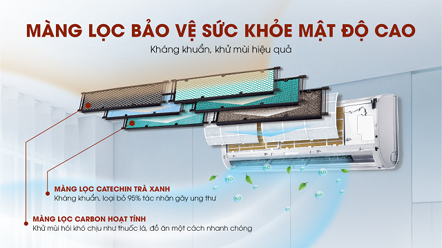 Trang bị màng lọc có mật độ cao hơn so với màng lọc thông thường, có tác dụng ngăn ngừa các loại bụi nhỏ và phấn hoa có trong không khí. Đặc biệt, GREE còn tích hợp thêm cho điều hoà Kool 2 màng lọc: catechin trà xanh và ion bạc, giúp tăng cường khả năng thanh lọc không khí, ức chế sự phát triển của vi khuẩn, nấm mốc, bảo vệ tối đa sức khoẻ người dùng.