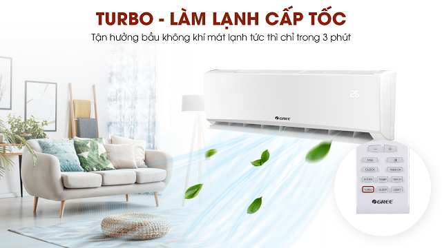 Khi người dùng nhấn nút “Turbo” trên remote, máy nén và quạt dàn lạnh sẽ hoạt động với công suất/tốc độ tối đa. Nhiệt độ phòng nhanh chóng được giảm xuống, lưu lượng gió lúc này lớn hơn và thổi xa đến 6m. Chỉ trong 3 phút, bạn sẽ cảm nhận hơi lạnh đã lan toả đều khắp phòng và tận hưởng không gian mát lạnh sảng khoái ngay tức thì.