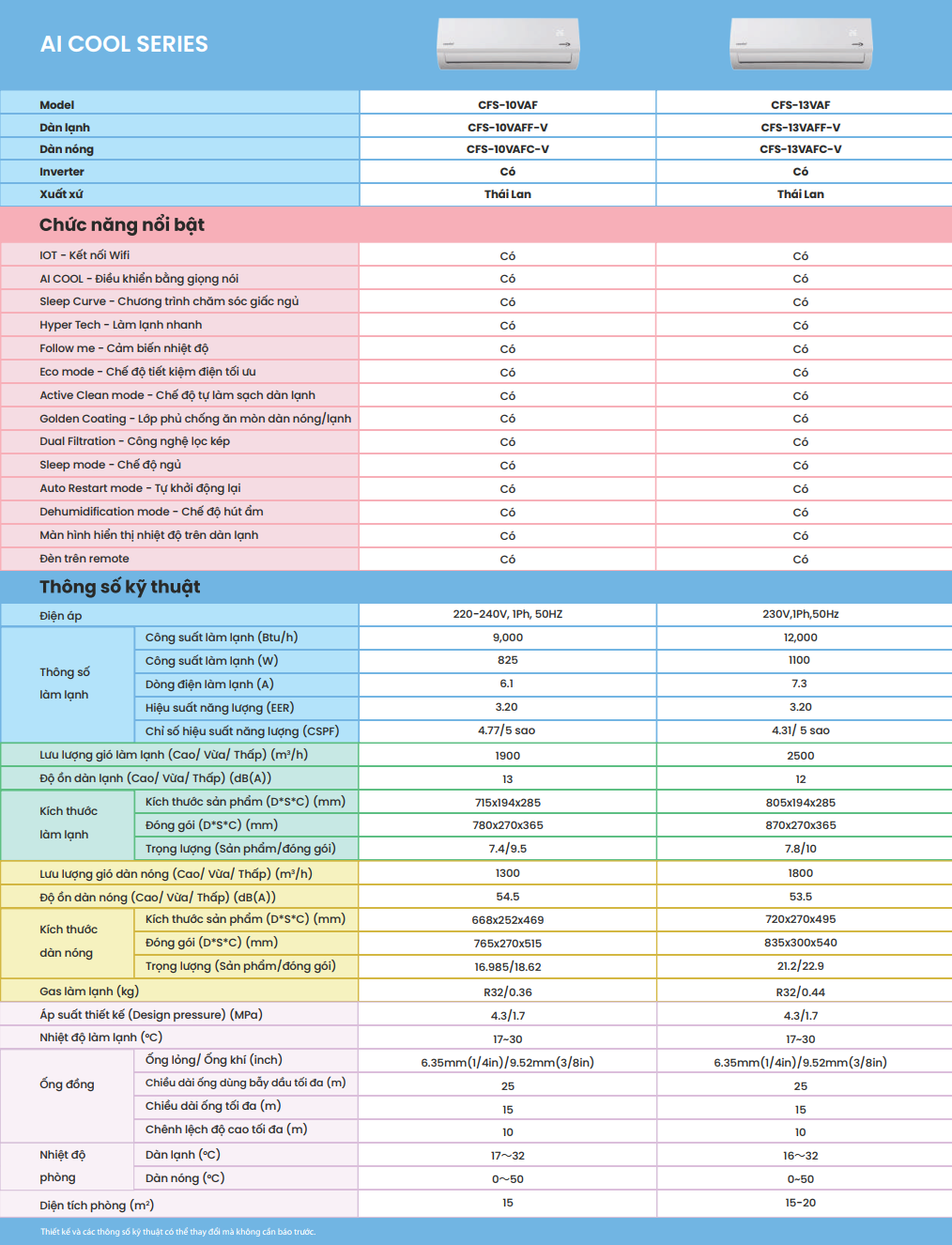 THÔNG SỐ KỸ THUẬT  ĐIỀU HÒA TREO TƯỜNG COMFEE CFS-VFA