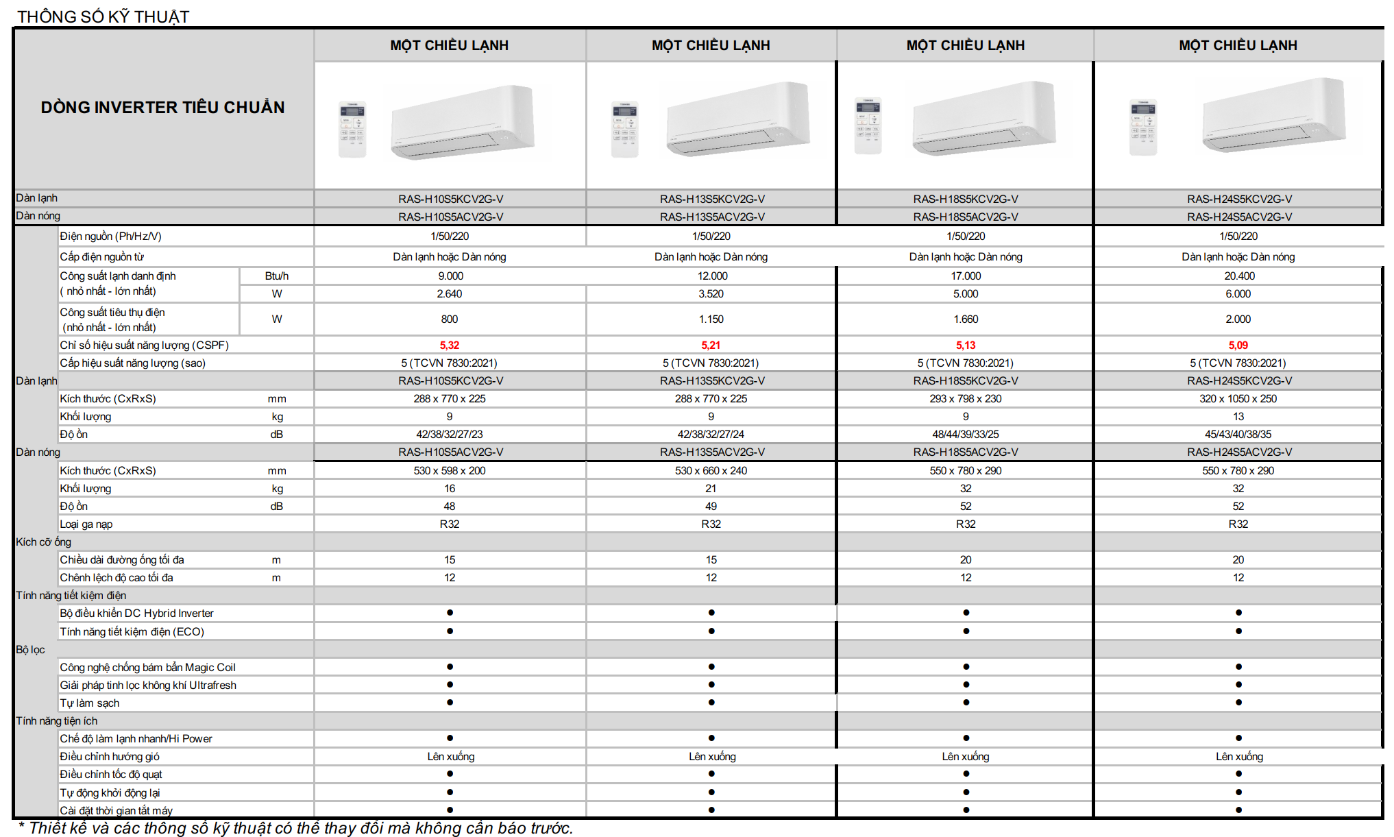 THÔNG SỐ KỸ THUẬT Điều hòa treo tường Inverter Toshiba RAS-H_S5KCV2G-V